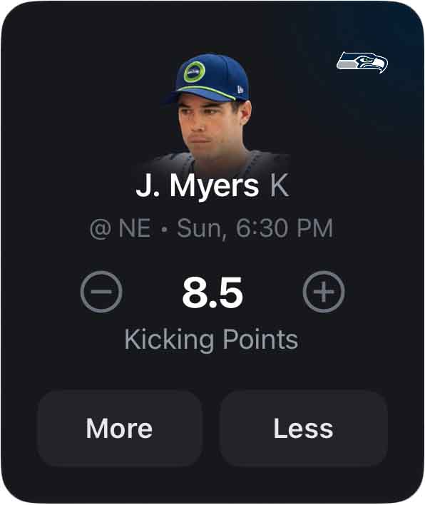 Myers led the league with 41 made field goals this year. With the Seahawks' primary red-zone hammer (Charbonnet) sidelined, Seattle is much more likely to settle for three points when drives stall inside the 20.