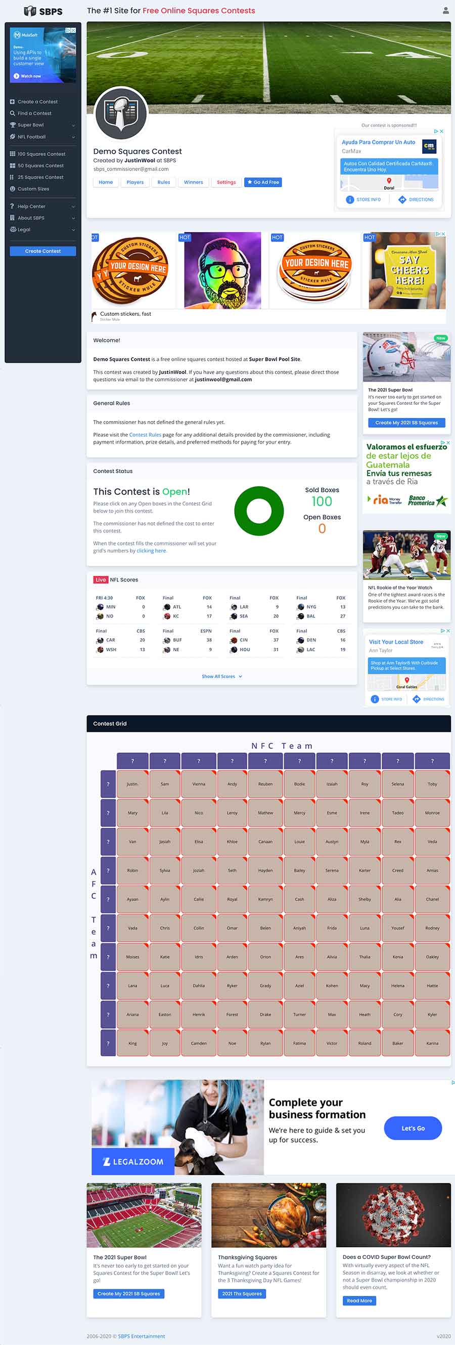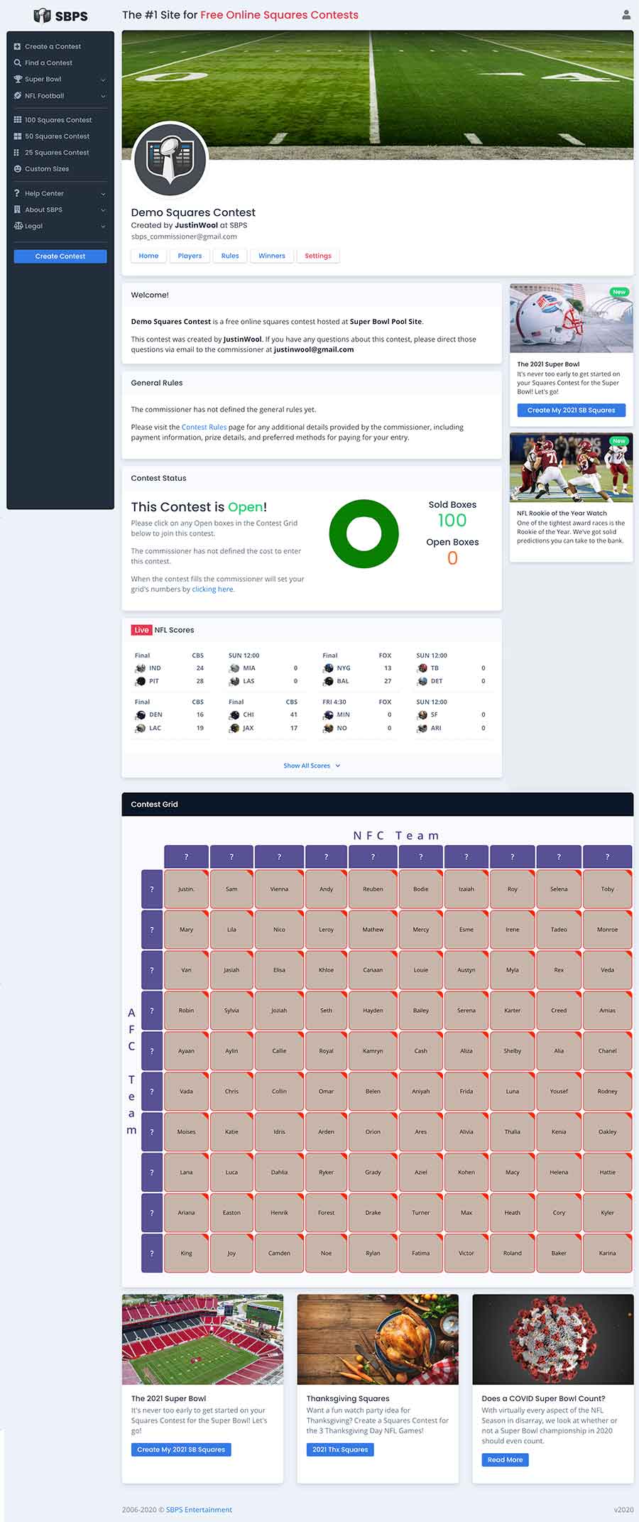 First you need to first make a Free Squares Contest. You can do this from the home page, the Super Bowl page, or any page on the site that allows the creation of free squares contests.